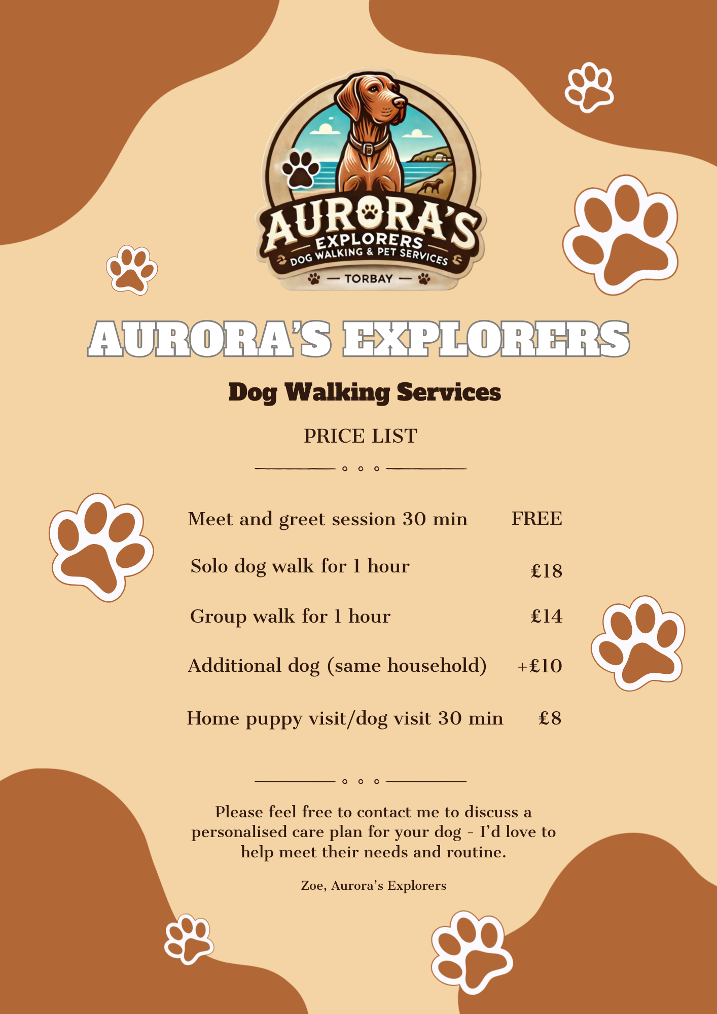 We are committed to providing safe, dependable, and high-quality pet care supported by professional training and experience. From structured dog walks to personalised home visits, our services are designed to meet the needs of busy owners and happy pets. Full current pricing details are shown in the digital leaflet on this page.